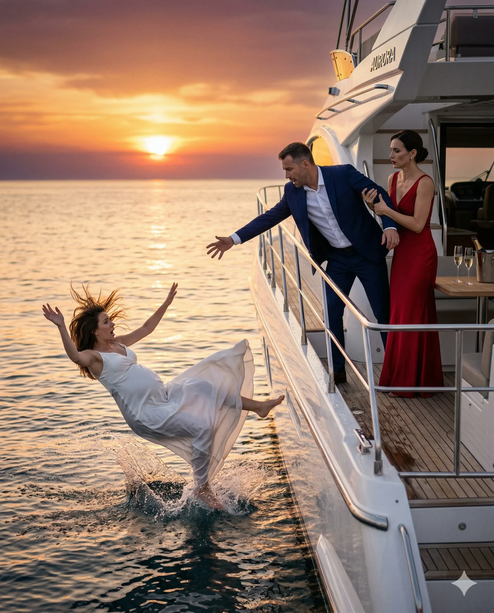 Pokret je bio iznenadan. U dahu, gurnuo ju je napred. Krik joj je presekao vazduh, ruke su posegle za ništa, a more je otvorilo svoj hladni dlan. Talasi su progutali zvuk, a jahta je nastavila kao da se ništa nije dogodilo.