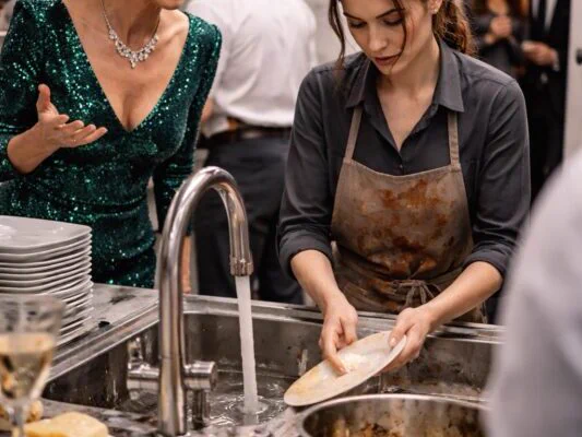 Vanessa, moja sestra, stajala je pored nje s čašom šampanjca u ruci. Njen izraz lica otkrio je strah, nesigurnost koju nikad do tada nisam primetio. Pitali su je zašto prlja suđe, a odgovor je bio suptilan.