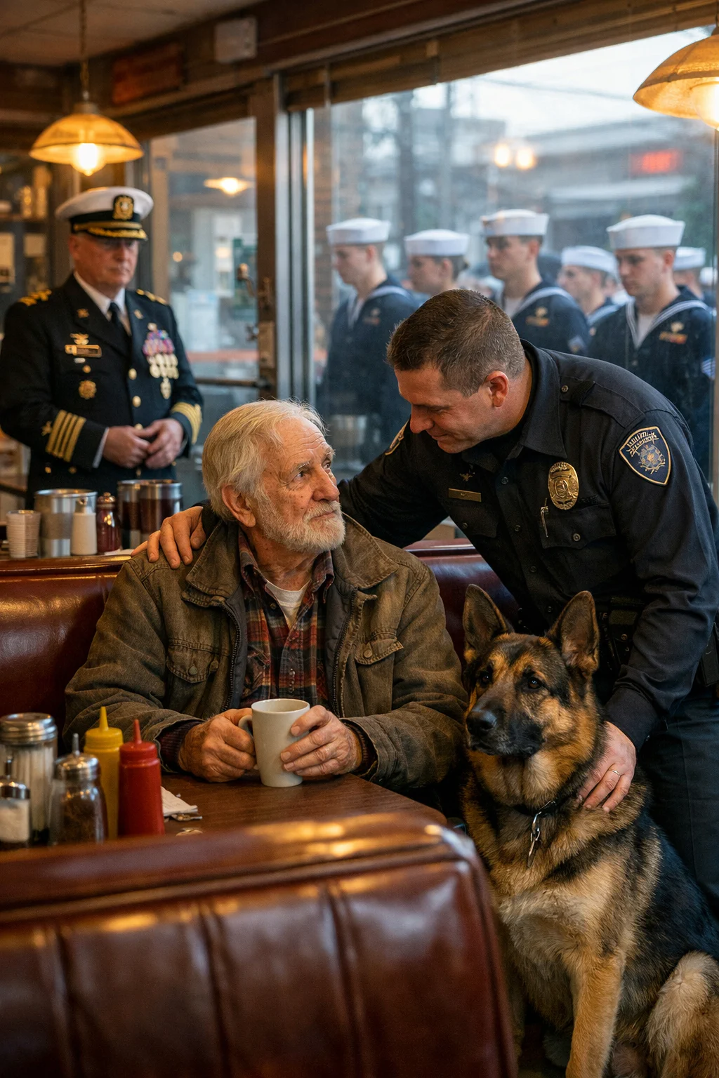 Sve je delovalo normalno — dok se policajac nije pojavio kraj našeg stola i hladno naredio da izbacimo psa napolje. Približio se toliko da sam u njegovom tonu osetio zadovoljstvo moći. Mirno sam objasnio da je Reks službeni pas, vojni veteran, u penziji. On se samo podrugljivo nasmejao i rekao da „federalni zakon ovde ne važi“. Kada sam odbio da ga izvedem, zapretio je da će me uhapsiti i poslati Reksa u prihvatilište. Reči su sekao vazduh: „stari“, „pas“. Ruka mu je već bila na lisicama. Kafić je utihnuo. 🥶