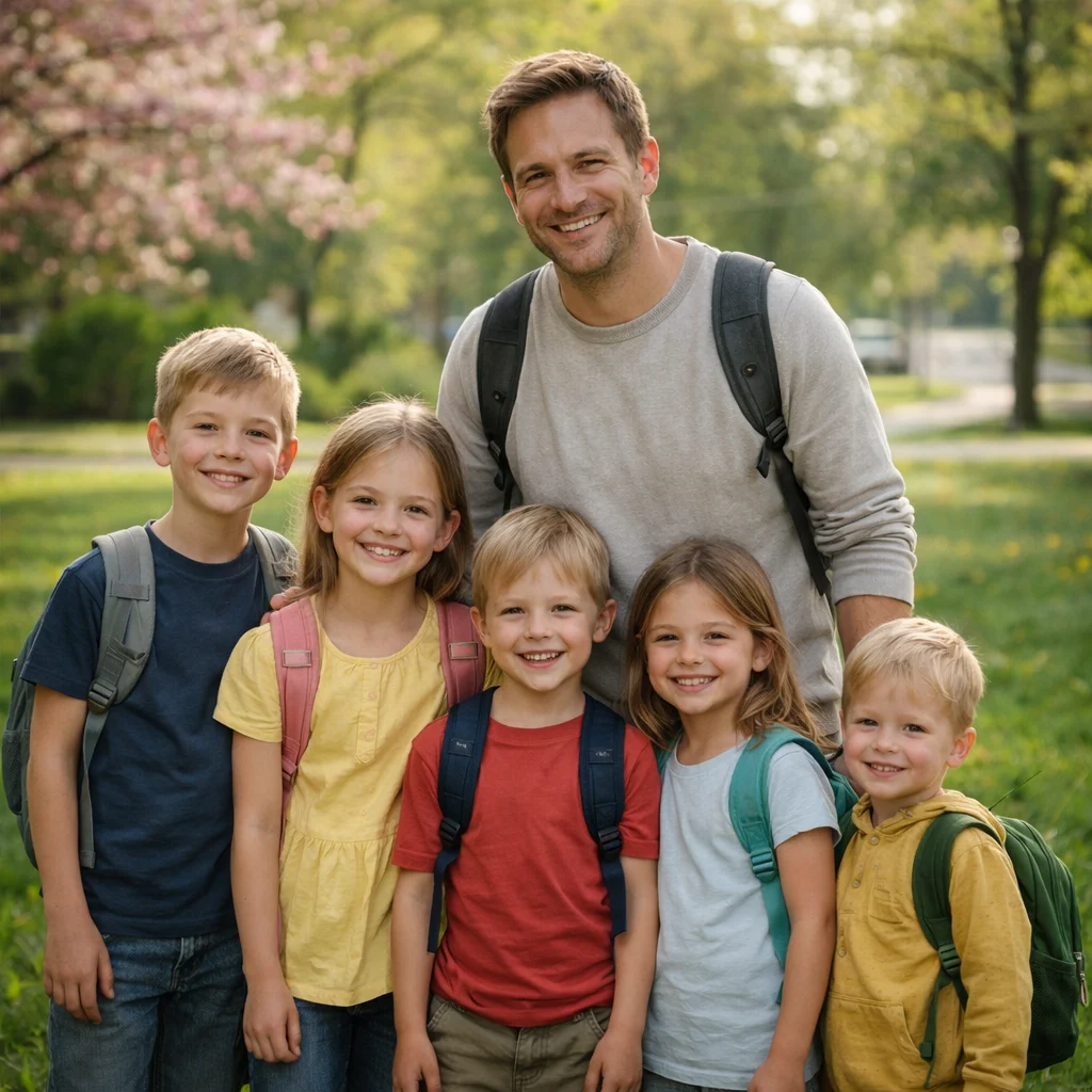 Oko njega — petoro dece, smeh pršti dok se nameštaju za fotografiju.