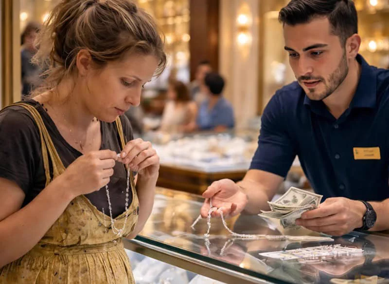 U salonu je zavladala tišina. Mladi prodavac je uzeo ogrlicu, pogled mu se zadržao na sitnim detaljima, kao da čita nevidljive uspomene u izgrebanom sjaju. Posle nekoliko sekundi progovorio je: „Mogu da vam dam petsto dolara.“